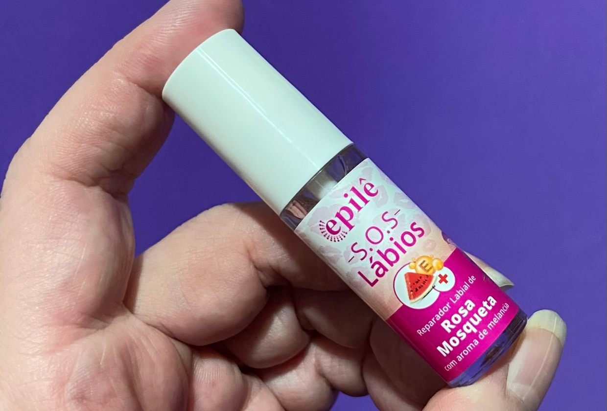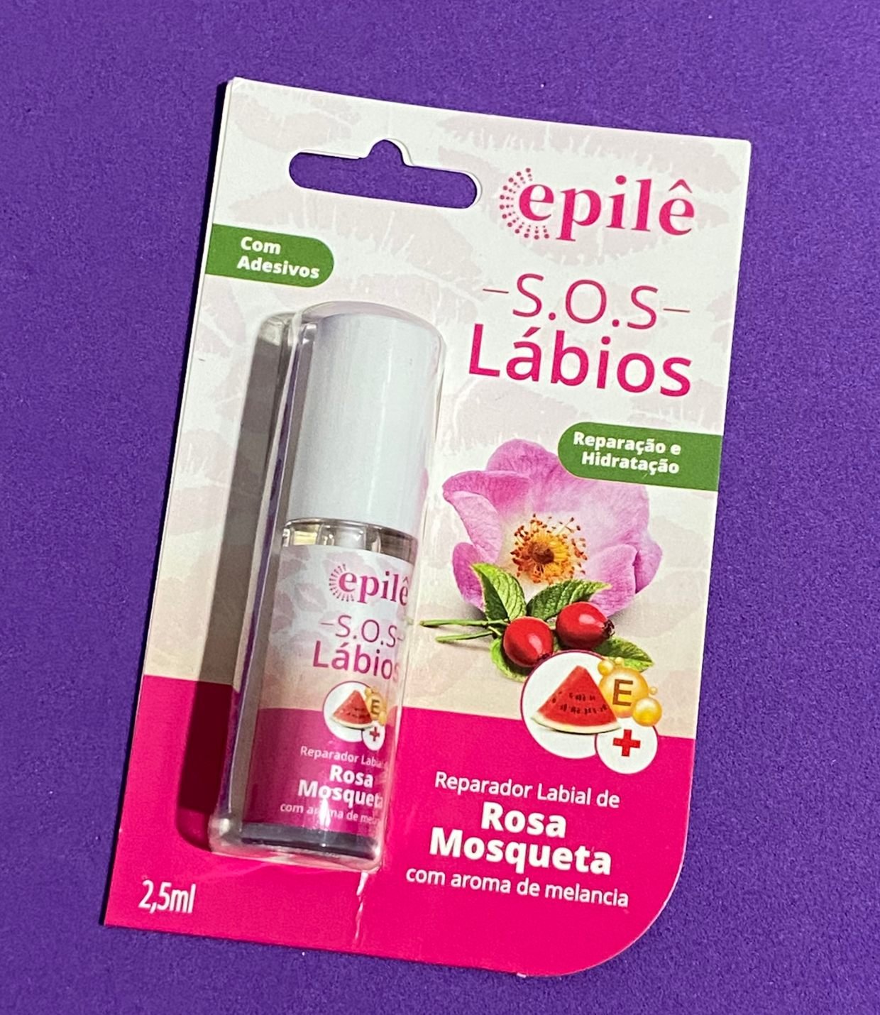 Pois é, eu estava nessa busca por um salvador da pátria quando recebi um produtinho que já no nome me chamou a atenção: o Hidratante Labial Epilê SOS Lábios com Rosa Mosqueta e aroma de Melancia.